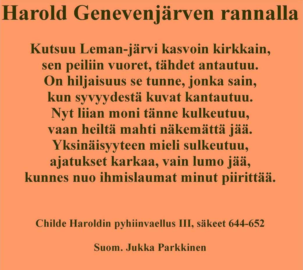 Pyhiinvaellusrunoelman kolmas canto ilmestyi 1816 ja neljäs, Italiassa kirjoitettu 1818. Maisemat ja niissä liikkuneet ihmiset tulevat runoissa esille, mm. Geneven- eli Leman-järvi.
