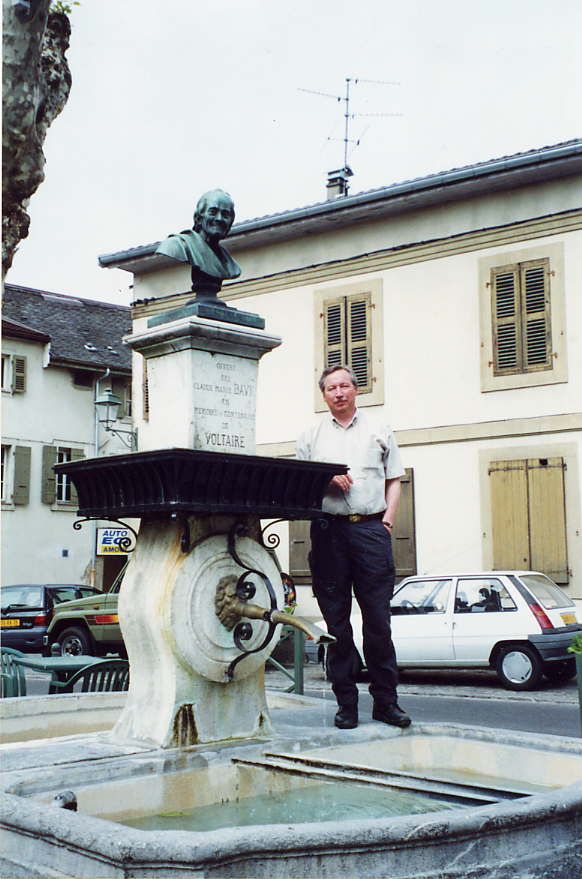 Voltaire asui useammassa paikassa Sveitsin ja Ranskan rajan molemmin puolin ollakseen valmiina häipymään, mikäli poliittinen tilanne niin vaati. Filosofi on antanut nimensä Geneven liepeillä olevalle Ferney Voltairen kaupungille. Voltaire vasemmalla.