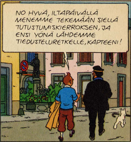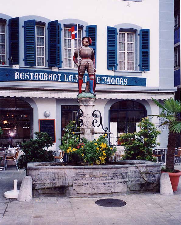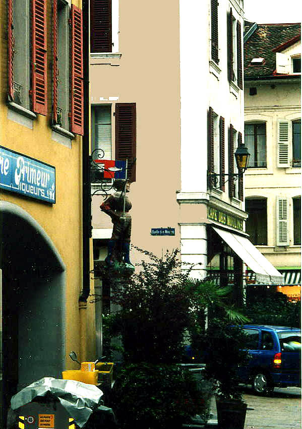 Vasemmalla Herra Jaques'n patsas on kuvattu samasta kulmasta kuin Tuhatkaunon tapauksessa. Sarjakuvaruudussa patsas on vasemalla näkyvän pysäköinninkieltomerkin oikealla puolella. Oikeanpuoleisessa kuvassa patsas näkyy edestä päin ravintola Le Maitre Jaques'n edessä.