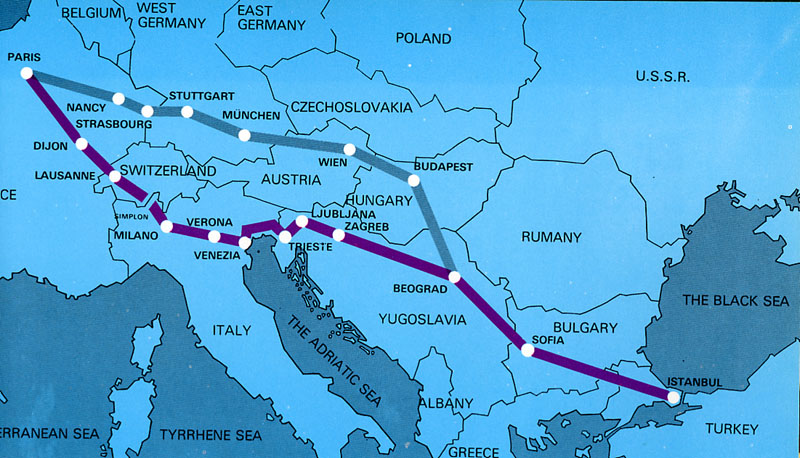Idän pikajunan reitit Pariisista Konstantinopoliin.