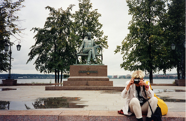 Maikki Harjanne on niin hämmentynyt Tšaikovskin patsaasta, että kuvaa sitä väärästä suunnasta.